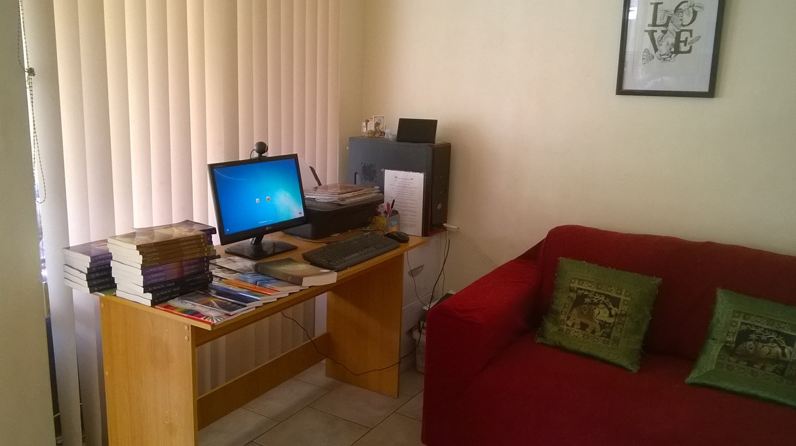 I work mostly from home as I tend to work unsociable hours. My desk is situated at a large window overlooking my garden. There are always lots of books on my desk and I am fortunate enough to have an aircon vent right overhead for those hot West Australian days.