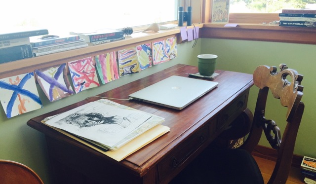 A wooden desk, my son’s art taped to the window sill, a view of the salt water, the islands, the mountains. I live on a small island; when I’m on the mainland, taking my boy to school and running errands, my work environment is my laptop and whatever coffee shop is handy.