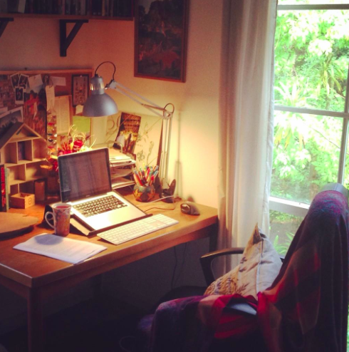 Technically, my work environment is my study, which has a wall of books, a beanbag and a view of our bushy, green garden. Often, it also has a cheeky chicken that’s snuck inside. But mostly I’ll write in the lounge room or in bed or out on the verandah. I have to be able to move around or my writing gets stuck.