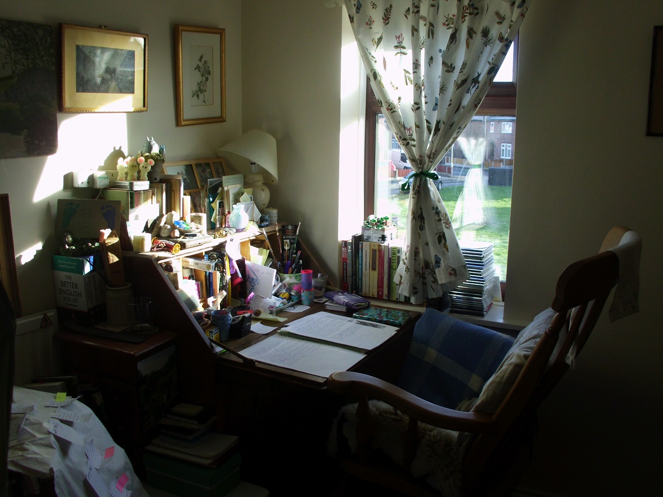 Messy and comfortable. I either work from the sofa with my cat beside or on me and my notes spread over the coffee table, cushions and floor, or in our little box-room where I have an old bureau and rocking chair and LOTS of bookcases. If I have a deadline and there are other humans in the house then this is the best option. My son has drawn on notes and manuscripts more than once so it’s best to remove that temptation from the room he’s in. I like to key into work-mode using sounds and smells so my bureau always smells of incense and I tend to play music in there when I’m settling down to write. It’s cozy and crammed with visual stimulation and one of my favourite places to be.